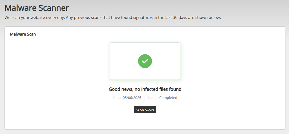 You can re-scan the site on demand. Once you believe you’ve removed the malware, head back to the Malware Scanner and select ‘Scan Again’.
